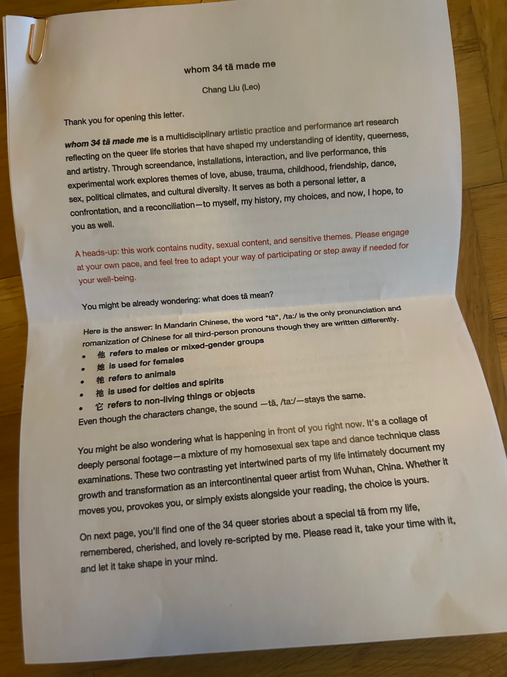 whom 34 tā made me is a multidisciplinary artistic practice and a dance exhibition work still in process, reflecting on 34 queer life stories that have shaped my understanding of identity, queerness, and artistry. Through screendance, installations, interaction, and live performance in collaboratin with participants, this experimental work explores themes of love, abuse, trauma, death, childhood, friendship, political climates, and cultural diversity, and sociopolitical issues through the lens of the fluid Chinese pronoun "tā", which reflects gender and non-human identity fluidity, I aim to explore the ways in which identity transcends cultural and political boundaries.
